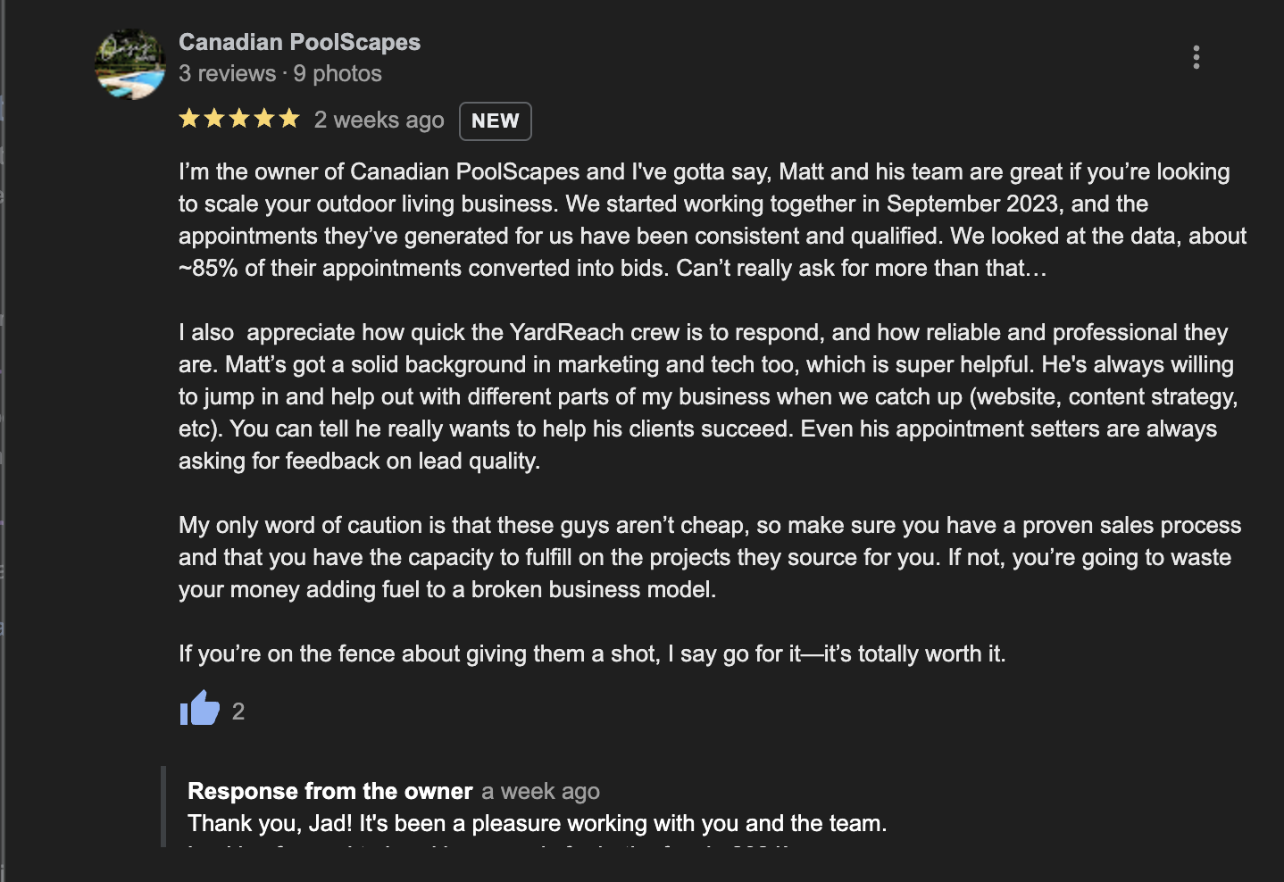 "I’m the owner of Canadian PoolScapes and I've gotta say, Matt and his team are great if you’re looking to scale your outdoor living business. We started working together in September 2023, and the appointments they’ve generated for us have been consistent and qualified. We looked at the data, about ~85% of their appointments converted into bids. Can’t really ask for more than that…
