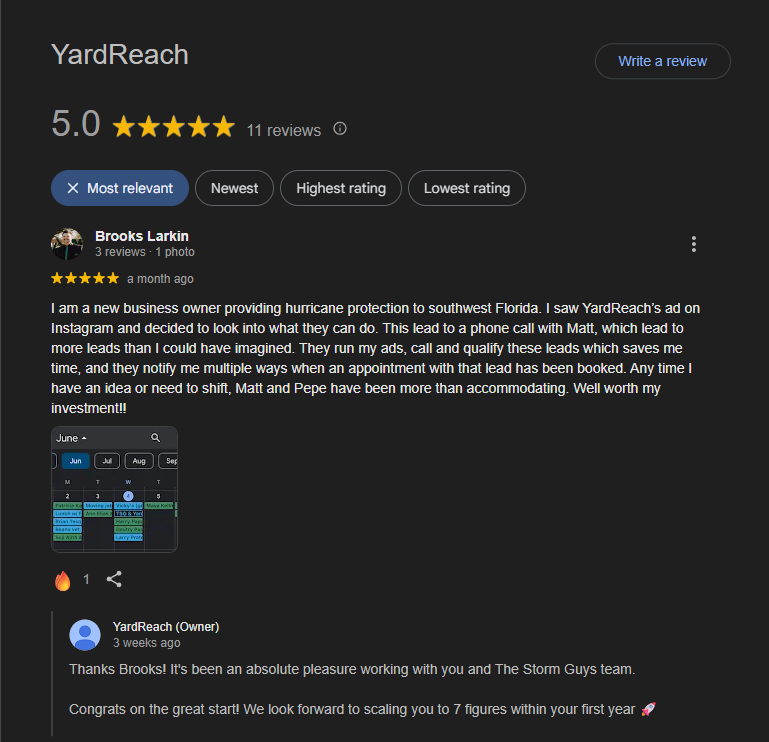 "I am a new business owner providing hurricane protection to southwest Florida. I saw YardReach’s ad on Instagram and decided to look into what they can do. This lead to a phone call with Matt, which lead to more leads than I could have imagined. They run my ads, call and qualify these leads which saves me time, and they notify me multiple ways when an appointment with that lead has been booked. Any time I have an idea or need to shift, Matt and Pepe have been more than accommodating. Well worth my investment!!"
